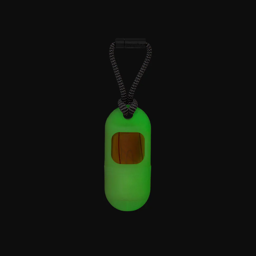 El dispensador de bolsas Glow-In-The-Dark no sólo permite recoger fácilmente las bolsas de excrementos a través de una abertura lateral, sino que está fabricado con un material que brilla en la oscuridad y proporciona seguridad cuando se paseas de noche.