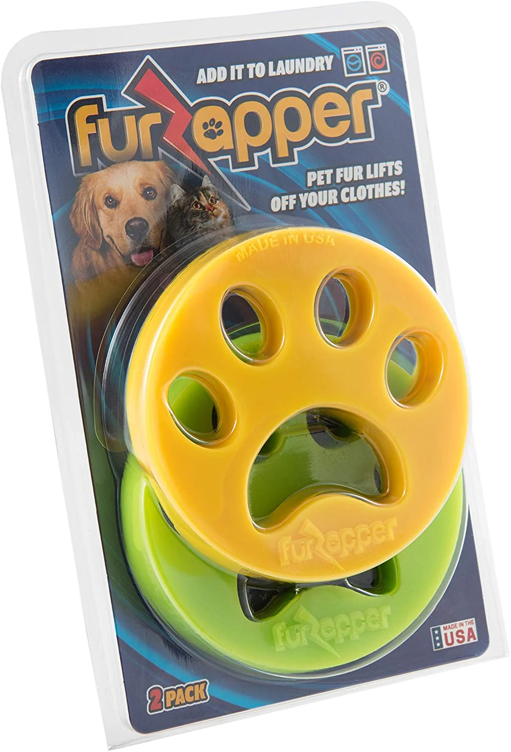 Di hola a FurZapper, el eliminador de pelos patentado para tu ropa. El mejor y único eliminador de pelos de mascotas para su lavandería. Un paquete de 2 es ideal para hogares con muchos pelos (2 o más mascotas que mudan). Use ambos en la lavadora y luego ambos en la secadora (funciona mejor en la secadora). Los FurZappers duran más de 100 usos y más ciclos de lavado y secado, y están garantizados para arrancar suavemente el pelo del perro o del gato de su ropa. Es mejor que un rodillo para pelusas, hojas para secadora o cualquier receta casera que pueda encontrar en Internet.