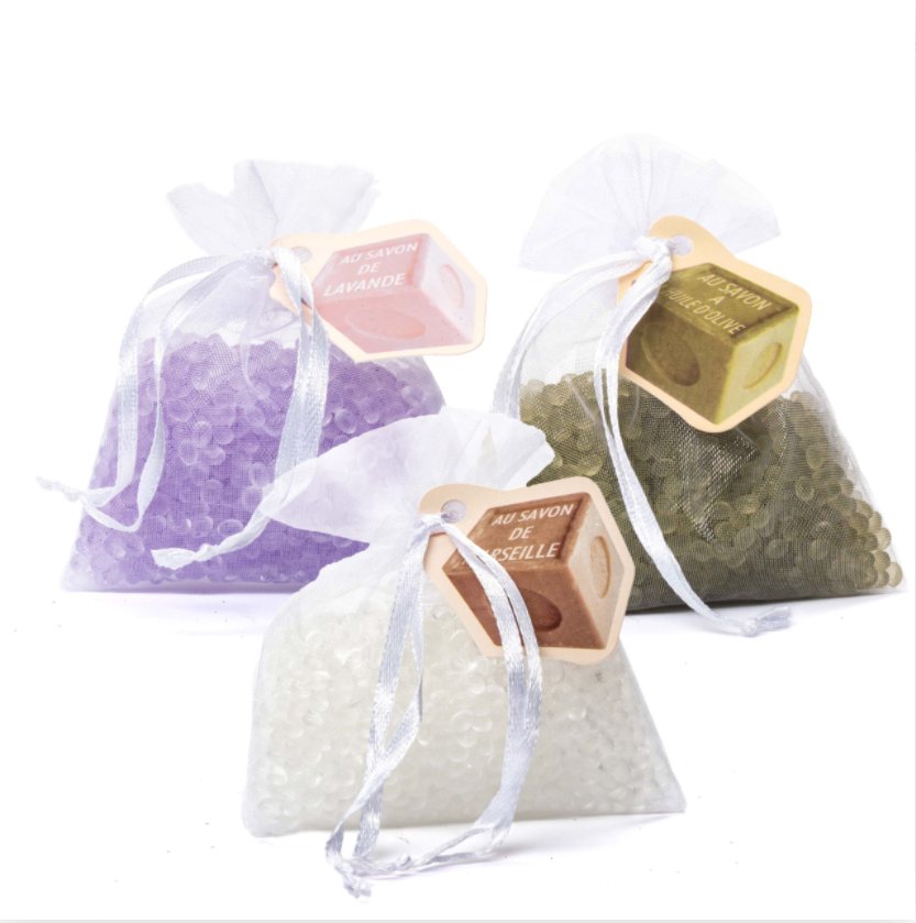 Mini resinas aromáticas presentadas en un saquito de tul de Au Savon de Marseille. La tecnología EVA permite que la fragancia en forma de perlas se libere gradualmente durante muchísimo tiempo. Es perfecta para perfumar la ropa en cajones. Dejando un saquito en cada cajón, notarás como la ropa adquiere el aroma elegido. Puede utilizarse también en otros rincones del hogar, en el automóvil, en maletas, ¡o incluso en el bolso!