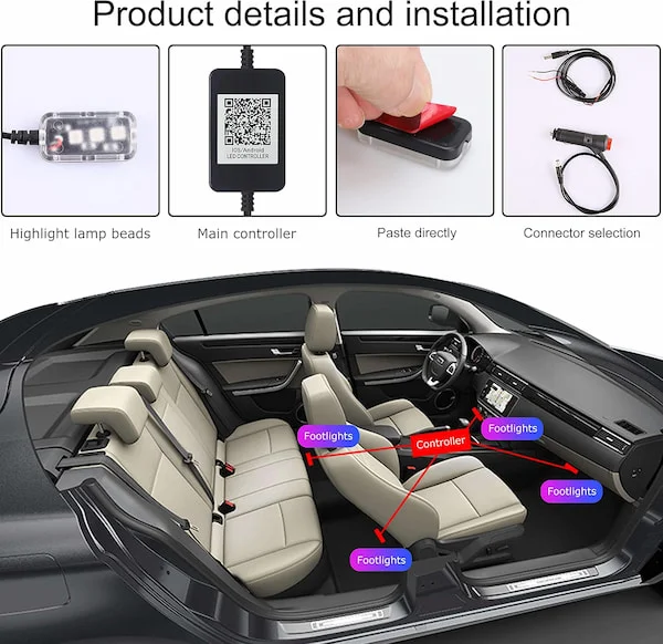 🚗 Fácil Instalación: Las luces se instalan fácilmente en cualquier parte del interior de tu coche, sin necesidad de herramientas complicadas.