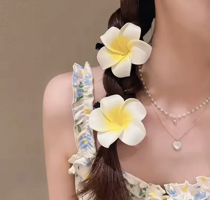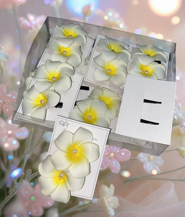 Agrega un toque especial a tus sandalias con los pasadores en par de flor hawaianos. Diseñados en tonos blancos y amarillos, estos accesorios cuentan con una apariencia súper linda que captura la esencia tropical y relajada. Perfectos para quienes buscan resaltar su estilo personal con detalles delicados y únicos.