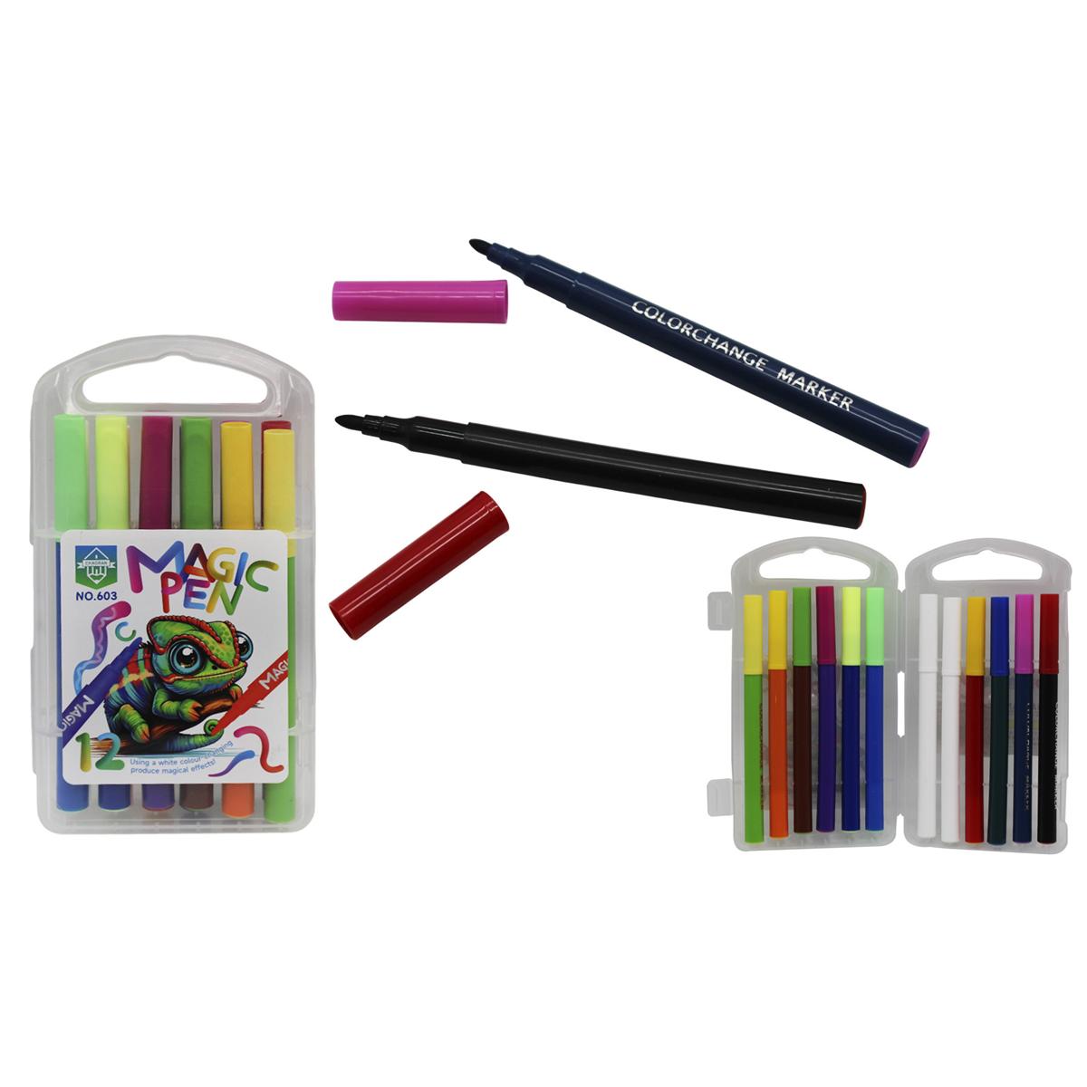 Set de 12 plumones mágicos que cambian de color al contacto con el plumón blanco especial incluido. Tinta no tóxica y colores vibrantes. Juntos haciendo negocio.