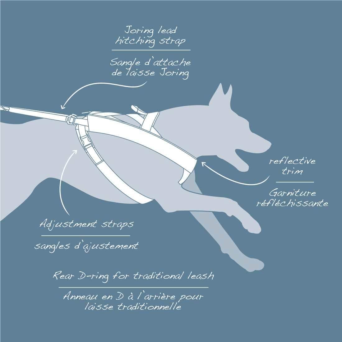 El sistema Omnijore™ Joring proporciona una forma divertida y cómoda de que un perro y un humano trabajen en equipo, con el perro tirando y el humano esquiando (skijoring), en monopatín, corriendo (estilo canicross) o en bicicleta (bikejoring).