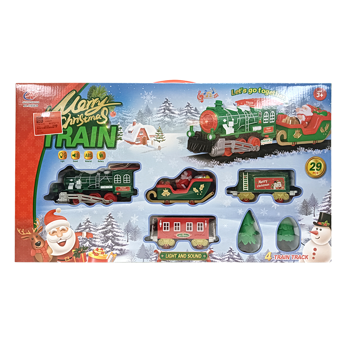 Fabricado en plástico resistente y de alta calidad, cada componente está pintado en tonos festivos como rojo, verde y dorado, con detalles cuidadosamente trabajados que resaltan su diseño artesanal. El tren cuenta con luces LED integradas que iluminan su recorrido, y efectos de sonido que reproducen el silbido y el avance del tren, creando una atmósfera cálida y alegre.