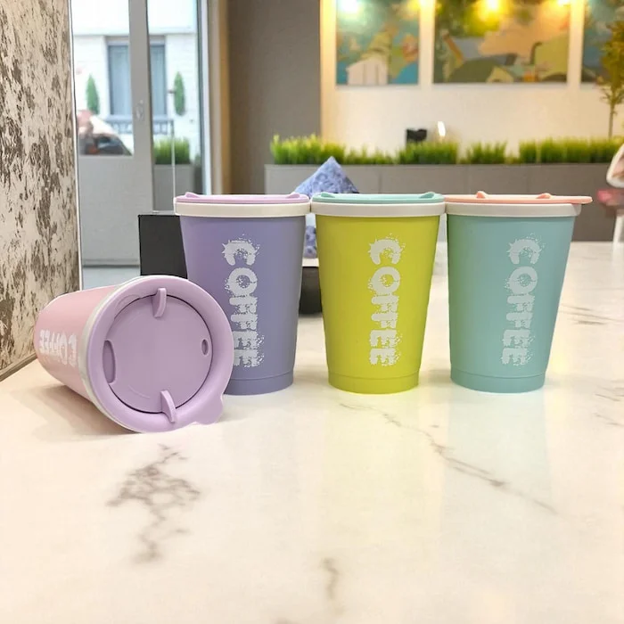Vaso de plástico resistente con tapa de rosca y apertura deslizante para beber. De excelente calidad, disponible en varios tonos, ideal para disfrutar tu café diario con estilo y comodidad.