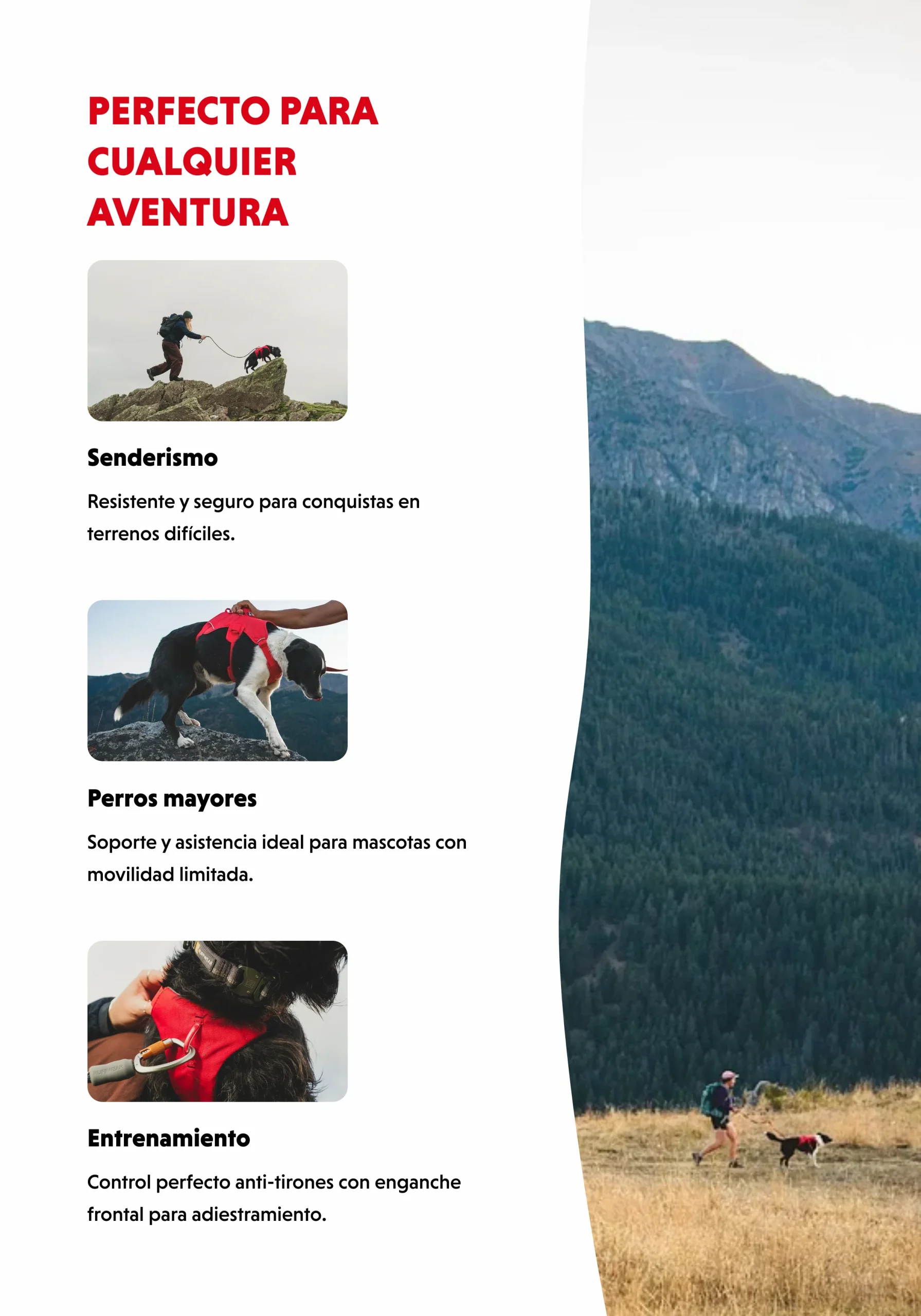 Actividades al aire libre, perros mayores o con movilidad limitada, y para perros escapistas gracias a su diseño de tres puntos de sujeción.